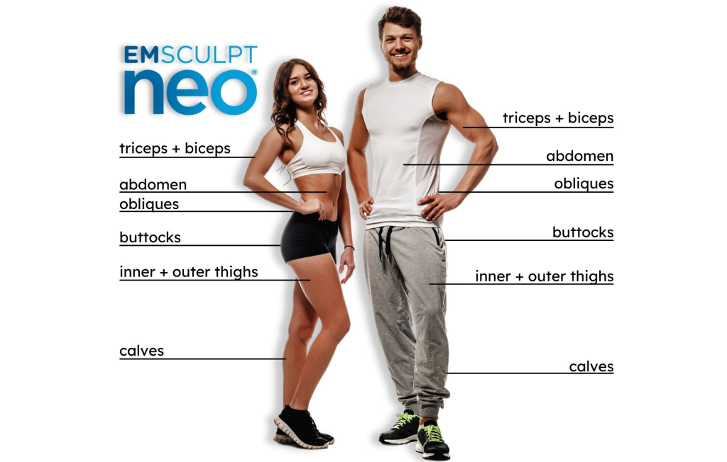 Just like the original treatment, Emsculpt NEO builds, strengthens, and tones the muscle groups of the abdomen, buttocks, arms, and legs (including thighs and calves.) In addition, Emsculpt NEO targets stubborn belly fat.